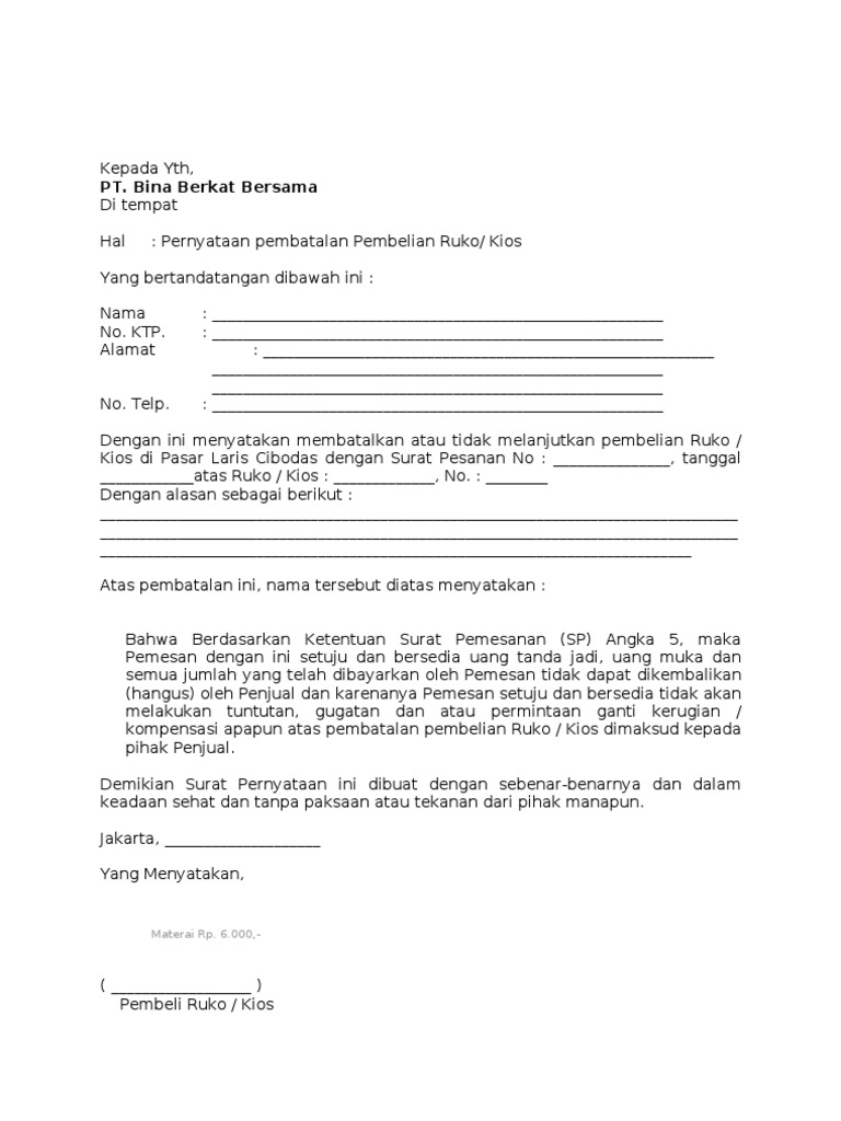 Surat Pernyataan Pembatalan Pembelian Kios Bbb Pdf